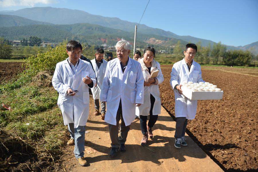 This file photo shows Kong Hainan (C, front) and his students on their way to take water samples of Erhai Lake in southwest China's Yunnan Province in November of 2013. (Shanghai Jiao Tong University/Handout via Xinhua)