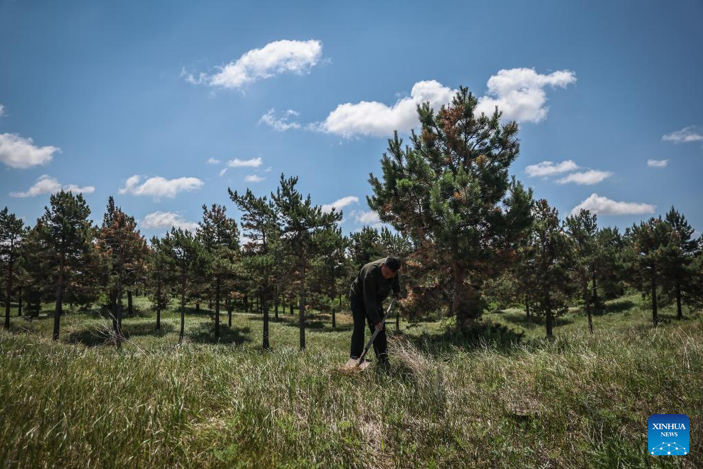 Li Dongkui checks the condition of trees at a forestry farm in Zhanggutai Town of Zhangwu County, Fuxin City of northeast China's Liaoning Province, June 4, 2025. Li Mingming, secretary of the Communist Party of China branch of Arxiang Village of Zhangwu County, Fuxin City of northeast China's Liaoning Province, is a native of Arxiang. Her father Li Dongkui is a locally renowned forest ranger. (Xinhua/Pan Yulong)