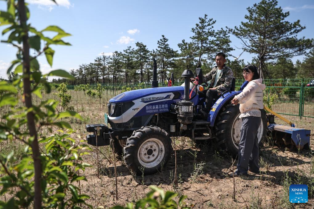 Li Mingming talks with a villager at an orchard in Arxiang Village of Zhangwu County, Fuxin City of northeast China's Liaoning Province, June 4, 2025. Li Mingming, secretary of the Communist Party of China branch of Arxiang Village of Zhangwu County, Fuxin City of northeast China's Liaoning Province, is a native of Arxiang. Her father Li Dongkui is a locally renowned forest ranger. (Xinhua/Pan Yulong)
