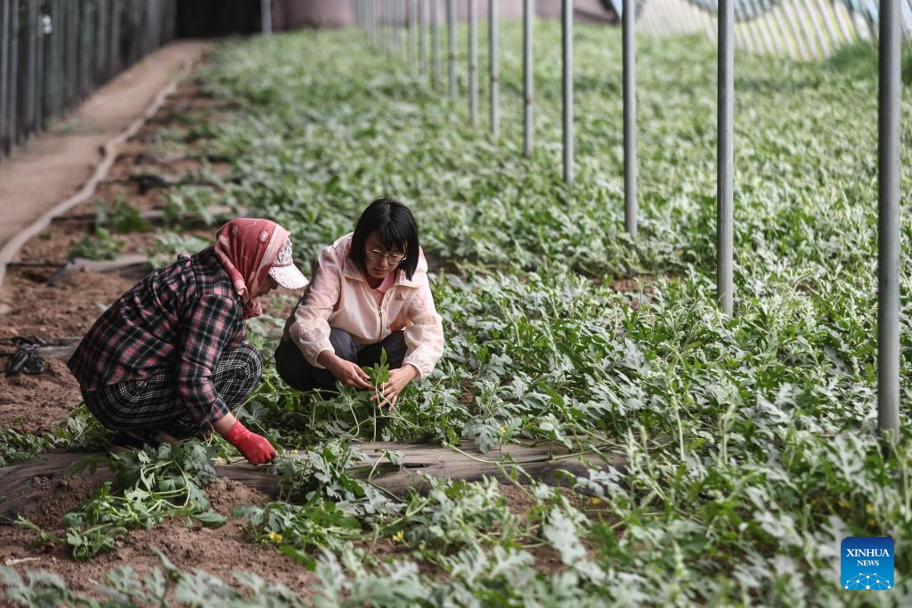 Li Mingming (R) checks the condition of watermelons with a worker in a greenhouse at an industrial park in Arxiang Village of Zhangwu County, Fuxin City of northeast China's Liaoning Province, June 3, 2025. Li Mingming, secretary of the Communist Party of China branch of Arxiang Village of Zhangwu County, Fuxin City of northeast China's Liaoning Province, is a native of Arxiang. Her father Li Dongkui is a locally renowned forest ranger. (Xinhua/Pan Yulong)