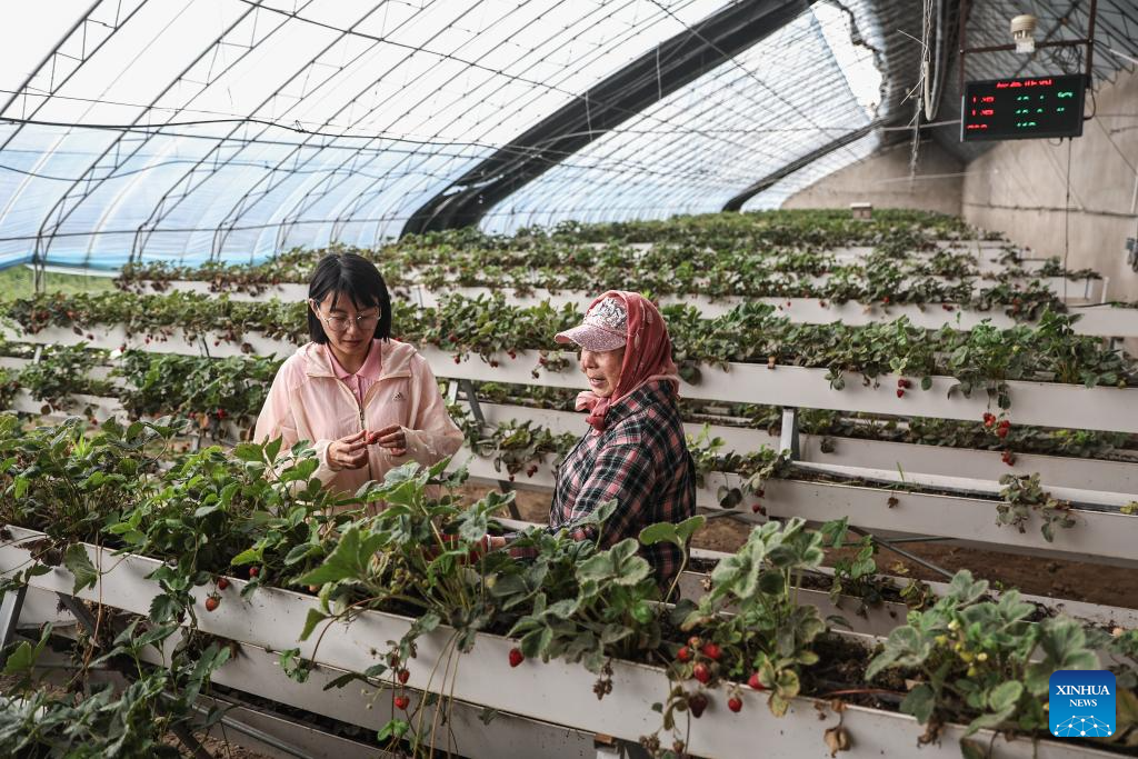 Li Mingming (L) talks with a worker in a strawberry greenhouse at an industrial park in Arxiang Village of Zhangwu County, Fuxin City of northeast China's Liaoning Province, June 3, 2025. Li Mingming, secretary of the Communist Party of China branch of Arxiang Village of Zhangwu County, Fuxin City of northeast China's Liaoning Province, is a native of Arxiang. Her father Li Dongkui is a locally renowned forest ranger. (Xinhua/Pan Yulong)