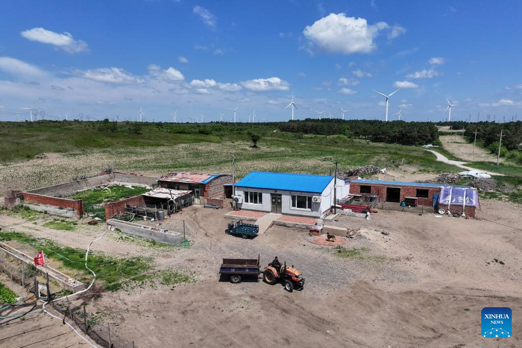 This aerial drone photo taken on June 4, 2025 shows an industrial park (front, blue greenhouses area) in Arxiang Village of Zhangwu County, Fuxin City of northeast China's Liaoning Province. Li Mingming, secretary of the Communist Party of China branch of Arxiang Village of Zhangwu County, Fuxin City of northeast China's Liaoning Province, is a native of Arxiang. Her father Li Dongkui is a locally renowned forest ranger. (Xinhua/Pan Yulong)
