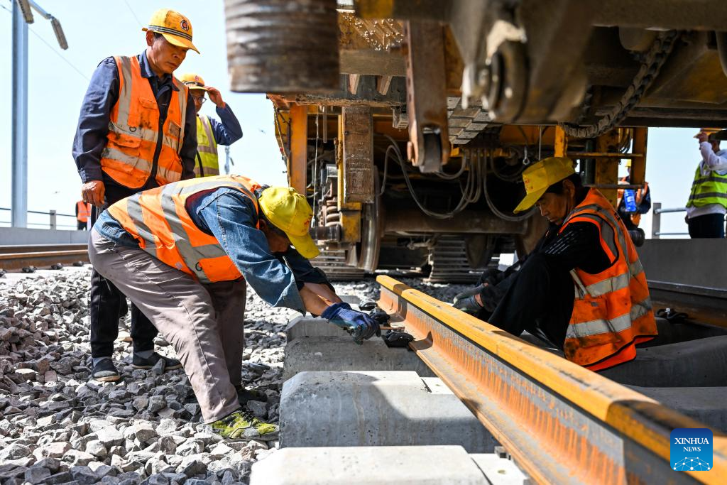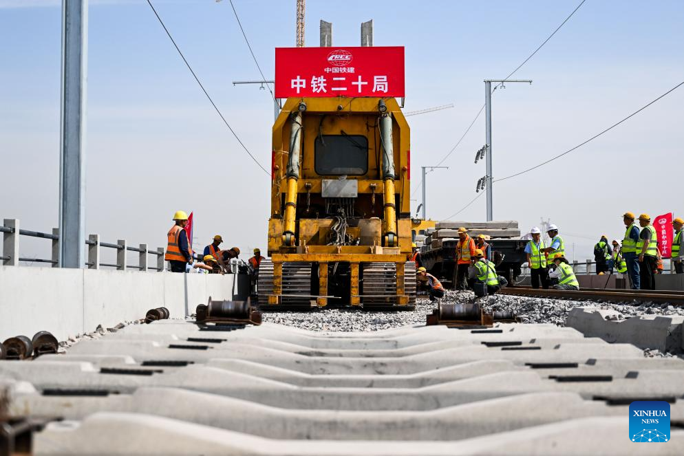 Workers lay steel rails at the construction site of the Wuhai Yellow River grand bridge in north China's Inner Mongolia Autonomous Region, June 6, 2025.
