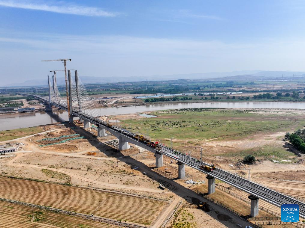 A steel rail laying machine operates at the construction site of the Wuhai Yellow River grand bridge in north China's Inner Mongolia Autonomous Region, June 6, 2025.