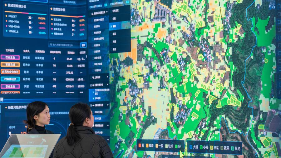 Technicians analyze the growth of crops with a satellite remote sensing system to make field management plan at a technology company at Tianfu New Area in Meishan City, southwest China's Sichuan Province, March 13, 2025. (Photo by Weng Guangjian/Xinhua)