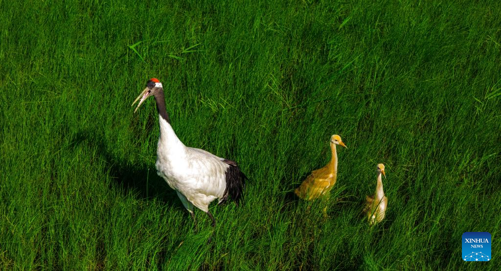 This drone photo taken on June 7, 2025 shows two red-crowned crane chicks following a parent bird in search of food at the Naoli River National Natural Reserve, northeast China's Heilongjiang Province. Located in the heartland of northeast China's Sanjiang Plain, the Naoli River National Natural Reserve is a major habitat for migratory birds in Northeast Asia. (Photo by Sheng Jingli/Xinhua)