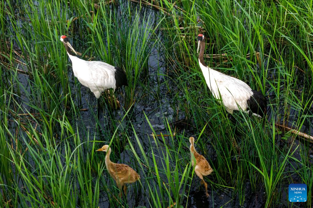 This drone photo taken on June 7, 2025 shows two red-crowned crane chicks following their parents in search of food at the Naoli River National Natural Reserve, northeast China's Heilongjiang Province. Located in the heartland of northeast China's Sanjiang Plain, the Naoli River National Natural Reserve is a major habitat for migratory birds in Northeast Asia. (Photo by Sheng Jingli/Xinhua)