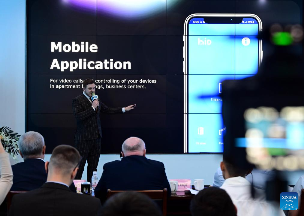 A contestant from Belarus attends a roadshow during the final of the 4th SCO (Shanghai Cooperation Organization) Member States Youth Innovation and Entrepreneurship Competition in Qingdao, east China's Shandong Province, June 8, 2025. The final was held here on Sunday, with 18 groups and projects from 9 countries attending. (Xinhua/Li Ziheng)