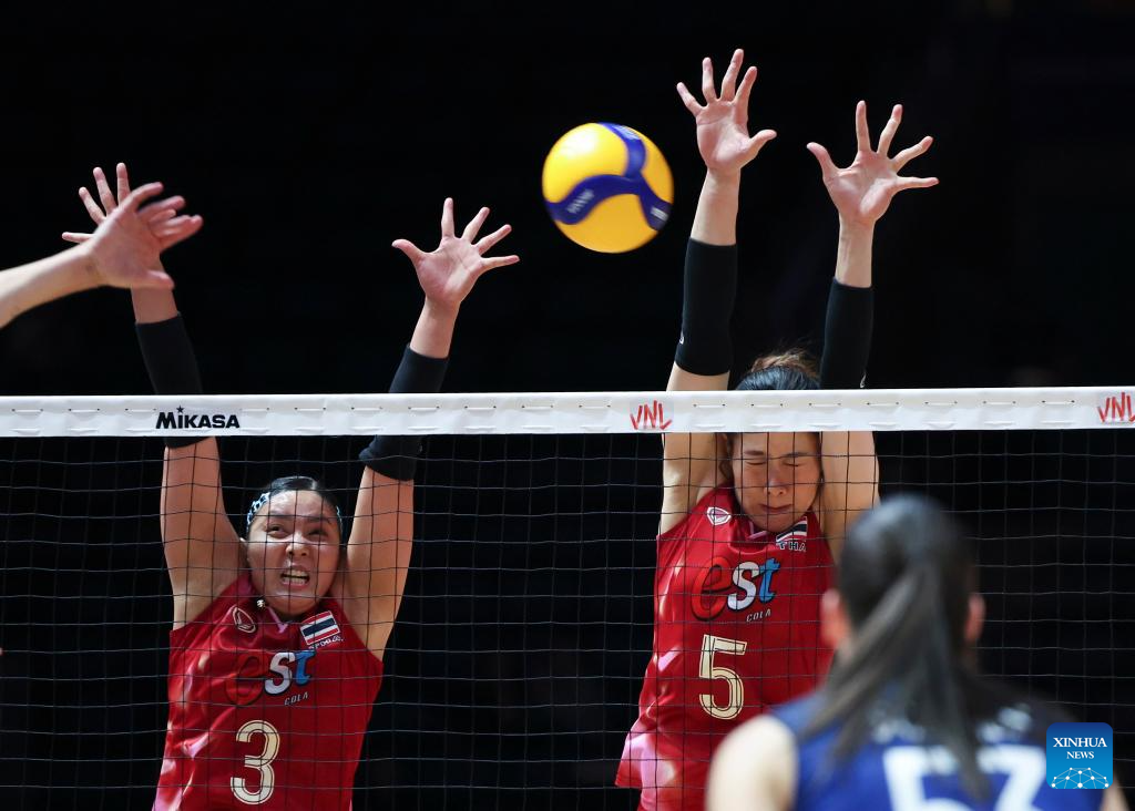 Thailand's Pimpichaya Kokram (C) spikes the ball during the Pool 3 match between France and Thailand at the Women's Volleyball Nations League (VNL) 2025 at the National Indoor Stadium in Beijing, China, June 8, 2025. (Xinhua/Luo Yuan)