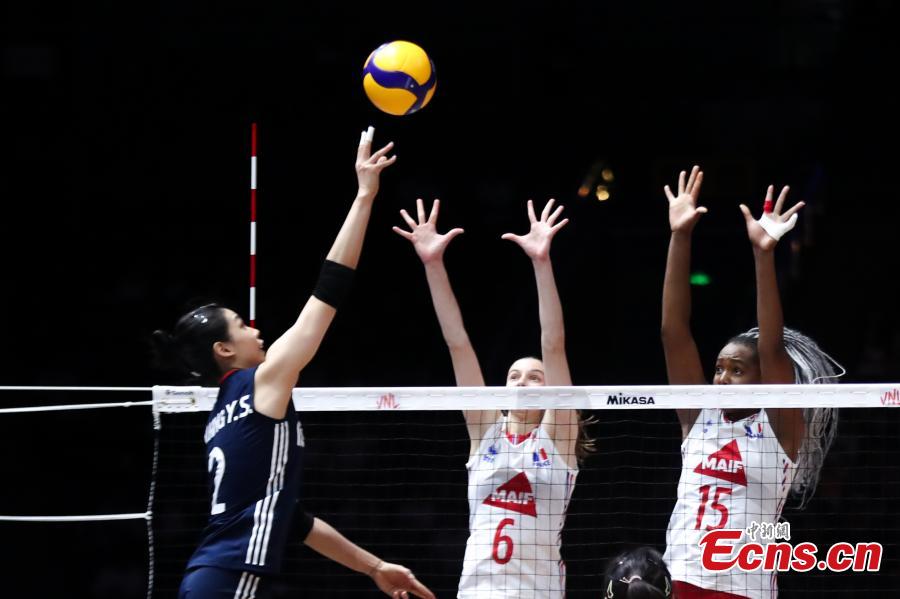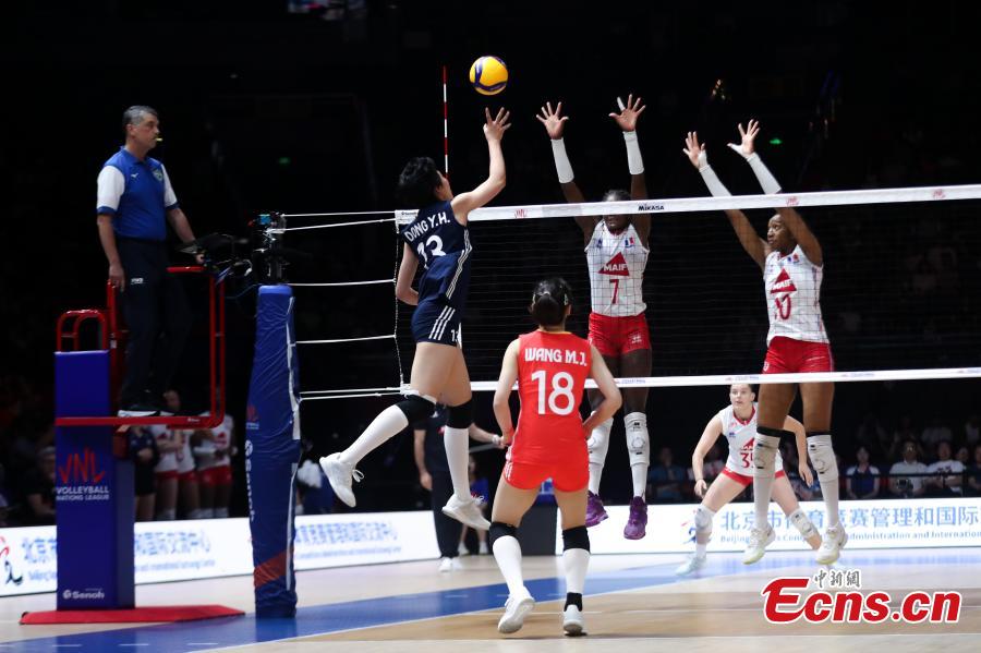 Chinese and French volleyball players compete at the Women's Volleyball Nations League (VNL) 2025 Beijing at the National Indoor Stadium in Beijing, China, June 7, 2025. (China News Service/Zhang Xiangyi)
