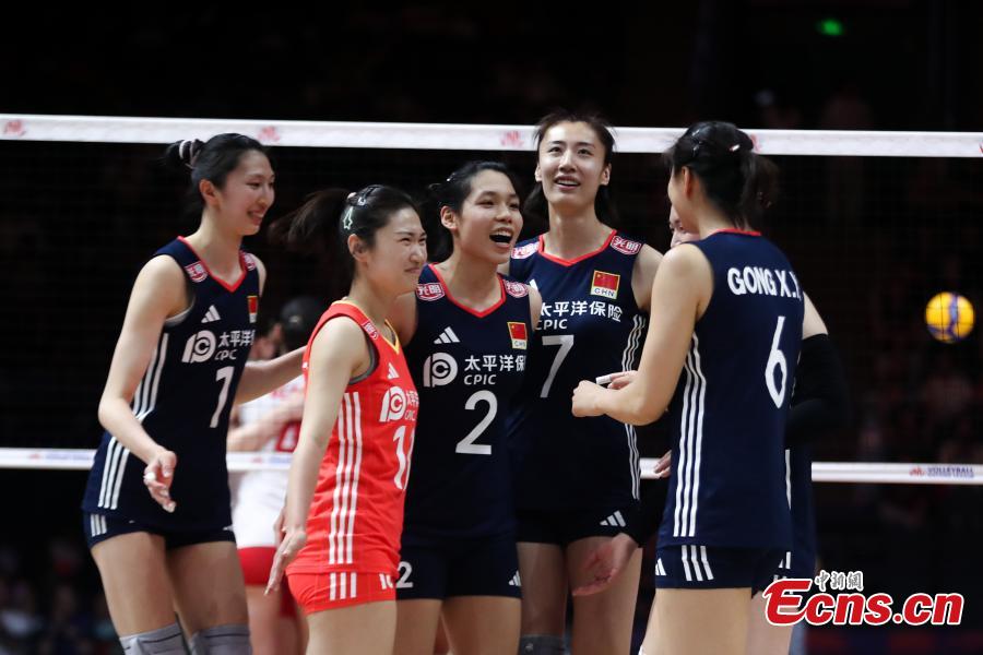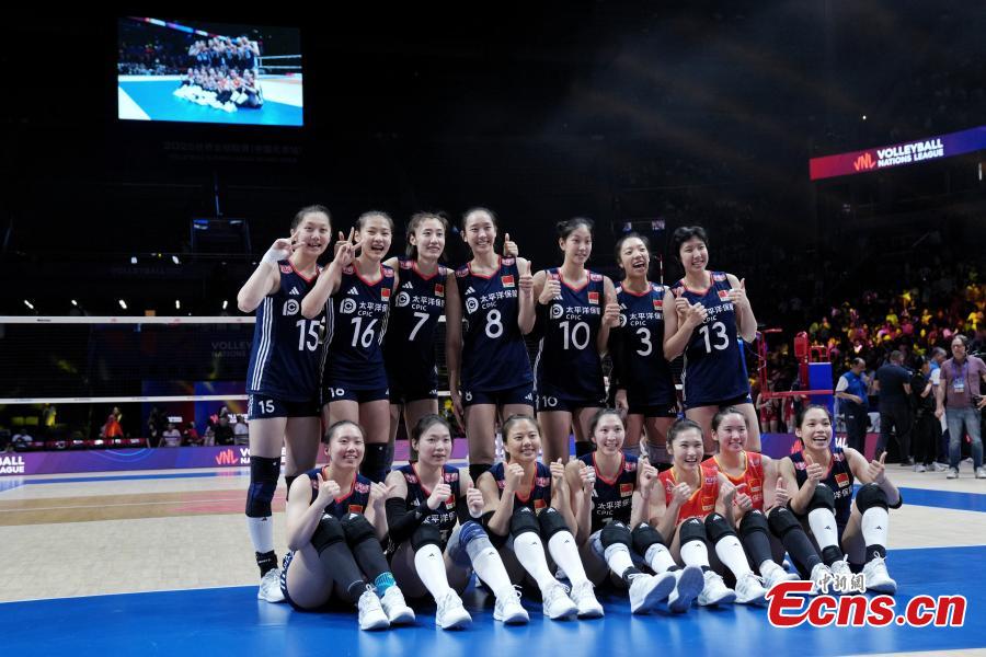 Players of China celebrate scoring during a match between China and France at the Women's Volleyball Nations League (VNL) 2025 Beijing at the National Indoor Stadium in Beijing, China, June 7, 2025. (China News Service/Zhang Xiangyi)