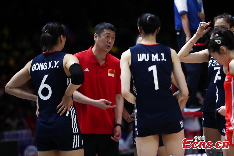 Chinese women's volleyball coach Zhao Yong guides his players during a match against France at the Women's Volleyball Nations League (VNL) 2025 Beijing at the National Indoor Stadium in Beijing, China, June 7, 2025. (China News Service/Zhang Xiangyi)