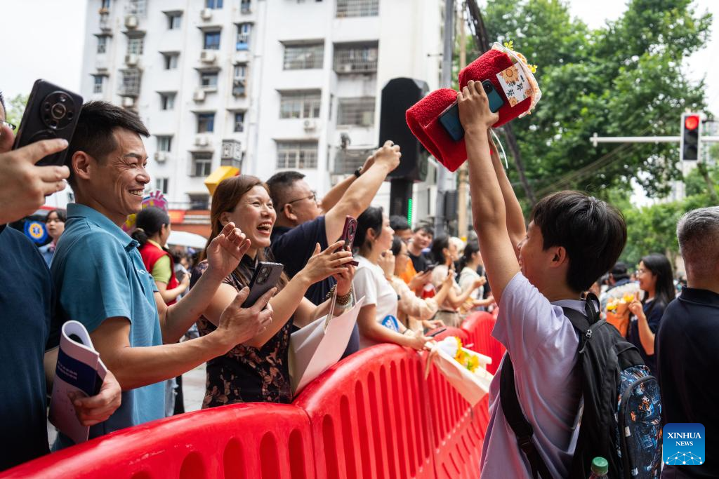 Parents celebrate for their son (1st R) after the exam at a national college entrance examination site in Changsha, central China's Hunan Province, June 9, 2025. China's national college entrance exam, also known as the gaokao, began on June 7 this year. The exam in some regions has ended on Monday. (Xinhua/Chen Sihan)