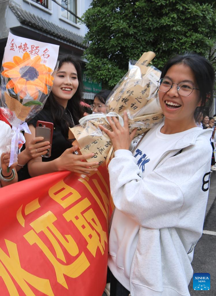 A student receives flowers after the exam at a national college entrance examination site in Qinhuangdao City, north China's Hebei Province, June 9, 2025. China's national college entrance exam, also known as the gaokao, began on June 7 this year. The exam in some regions has ended on Monday. (Photo by Cao Jianxiong/Xinhua)