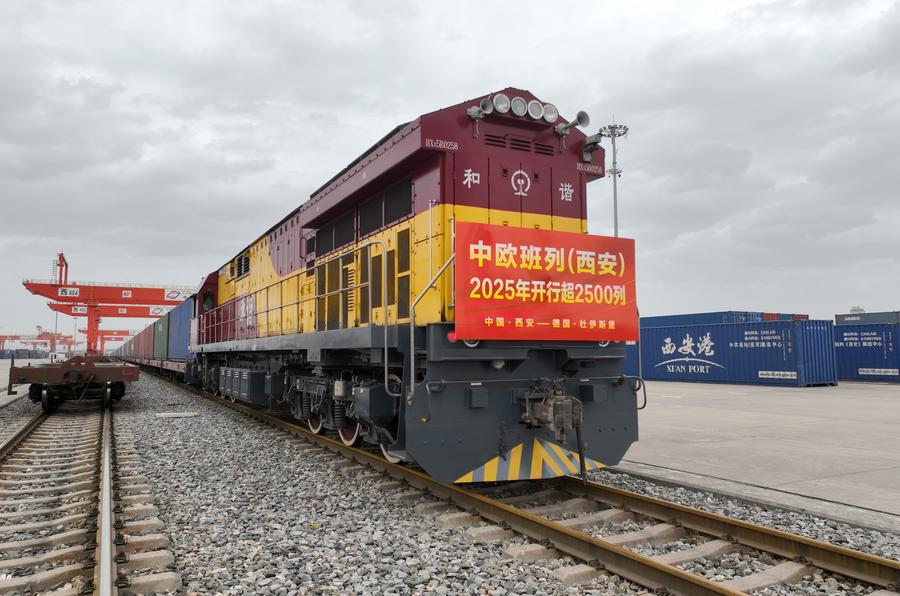 An aerial drone photo taken on May 22, 2025 shows China-Europe freight train X8489 loaded with autos, machine parts and home appliances before its departure for Duisburg, Germany, in Xi'an, northwest China's Shaanxi Province. (Photo by Sun Jixiang/Xinhua)