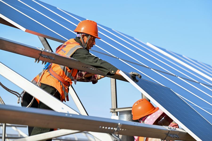 Workers install photovoltaic panels at a photovoltaic project in Kubuqi Desert, north China's Inner Mongolia Autonomous Region, June 6, 2025. (Xinhua/Li Zhipeng)