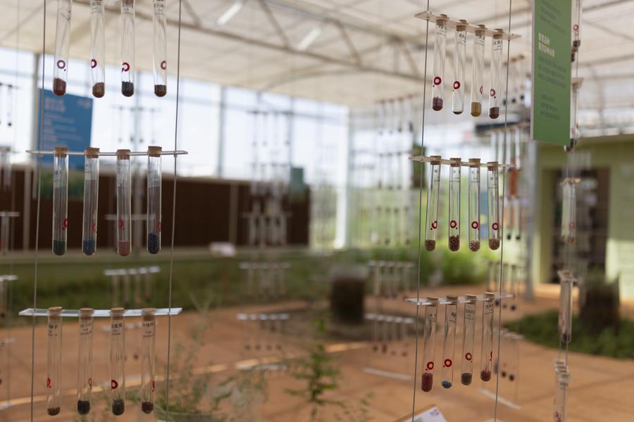A staff member introduces desert plant specimens at an integrated sand control and photovoltaic project at a state forestry area in the edge of Ulan Buh Desert in Linhe District of Bayannur, north China's Inner Mongolia Autonomous Region, June 5, 2025. (Xinhua/Gao Wei)