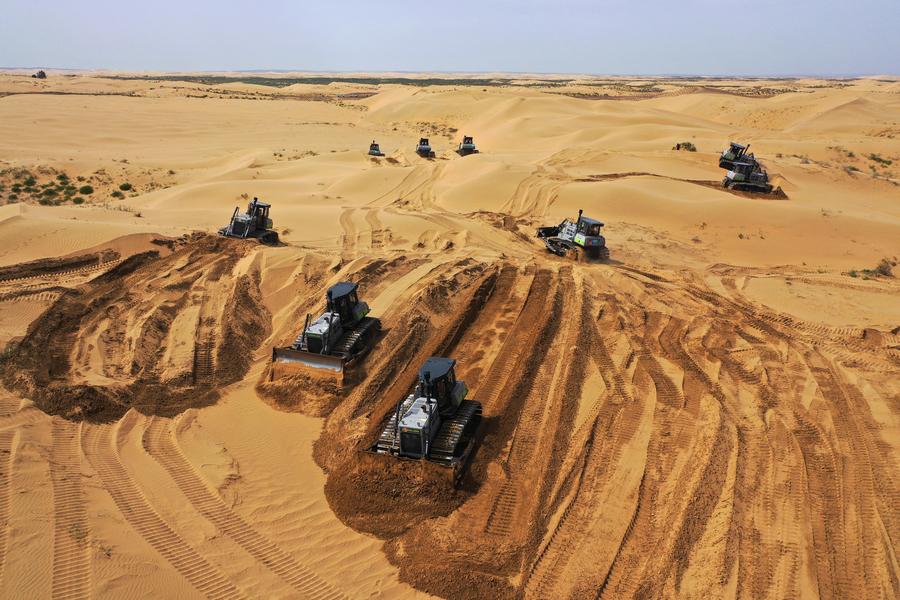 An aerial drone photo taken on June 7, 2025 shows machineries leveling sandy land for the construction of a photovoltaic project in Kubuqi Desert in Dalad Banner of north China's Inner Mongolia Autonomous Region. (Xinhua/Li Zhipeng)