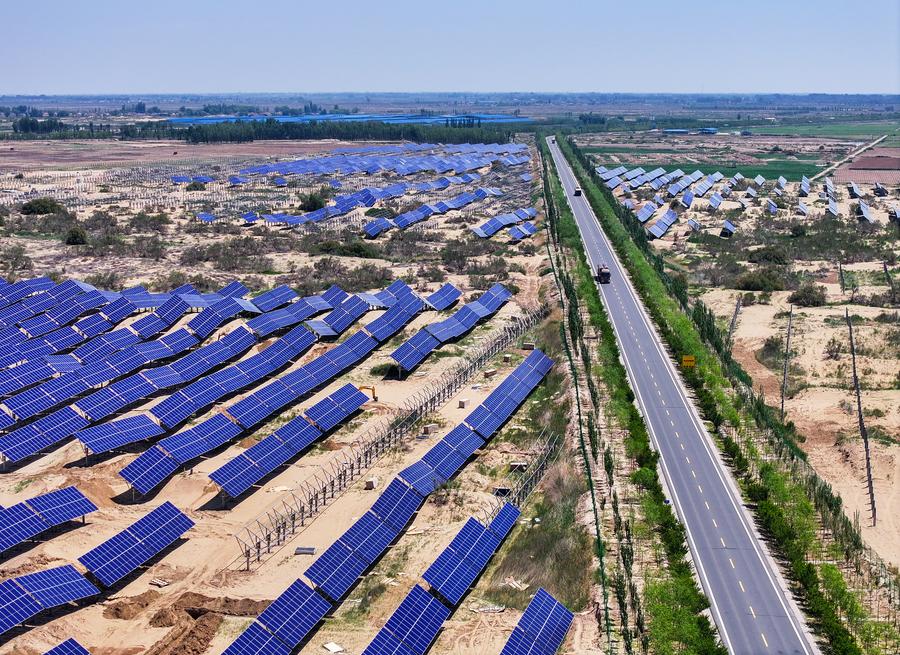 An aerial drone photo taken on June 5, 2025 shows an integrated sand control and photovoltaic project at a state forestry area in the edge of Ulan Buh Desert in Linhe District of Bayannur, north China's Inner Mongolia Autonomous Region. (Xinhua/Lian Zhen)
