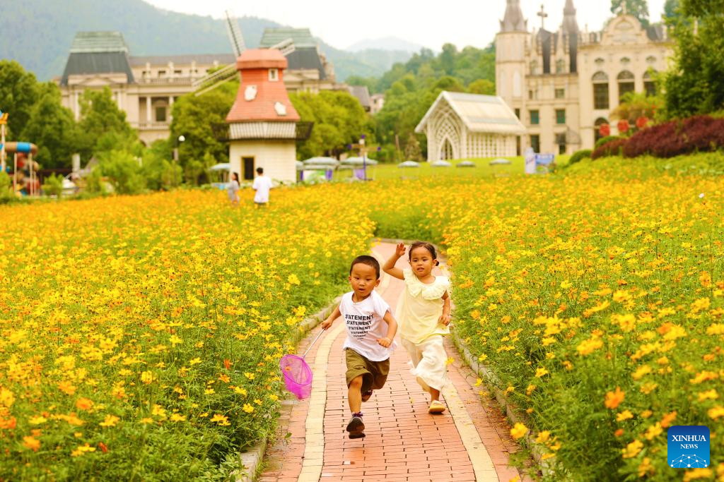 Children enjoy themselves among chrysanthemum flowers at a park in Qianjiang District, southwest China's Chongqing Municipality, June 8, 2025. (Photo by Yang Min/Xinhua)