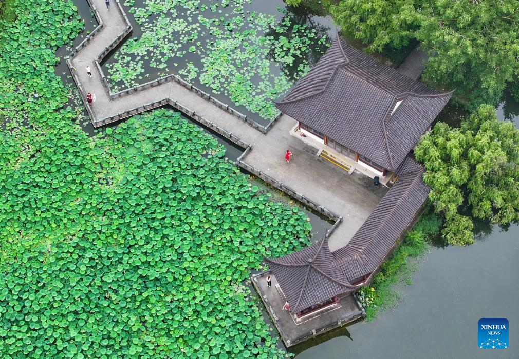 A drone photo taken on June 8, 2025 shows people enjoying lotus flowers at a park in Nanning, south China's Guangxi Zhuang Autonomous Region. (Photo by Yu Xiangquan/Xinhua)