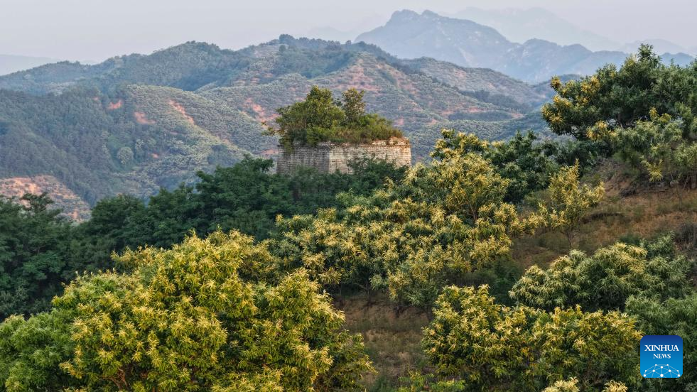 An aerial drone photo taken on June 9, 2025 shows chestnut blossoms near the ancient Great Wall in Zunhua City, north China's Hebei Province. (Photo by Liu Mancang/Xinhua)