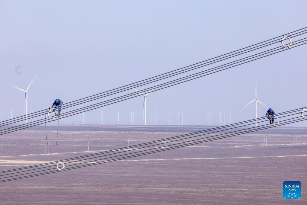 An aerial drone photo shows staff checking cables of the Hami-Chongqing ±800 kV ultra-high voltage direct current transmission project, in Hami, northwest China's Xinjiang Uygur Autonomous Region, April 8, 2025. The State Grid Corporation of China on Tuesday announced the operation of the ±800 kV ultra-high voltage direct current transmission project linking eastern Xinjiang's Hami with southwest China's Chongqing Municipality.