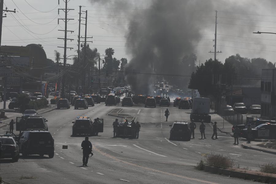 Heavy smoke is seen as protesters clash with Los Angeles sheriff deputies in Paramont, Los Angeles County, California, the United States, June 7, 2025. (Photo by Qiu Chen/Xinhua)