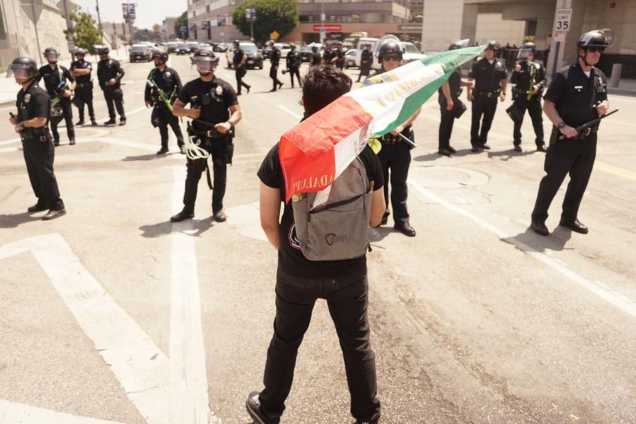 A protester faces off with police officers in downtown Los Angeles, California, the United States, on June 9, 2025. (Photo by Zeng Hui/Xinhua)