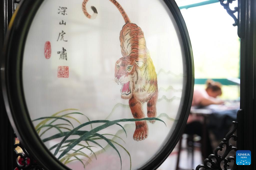 A hair embroidery artwork is displayed at the Jiali hair embroidery factory in Dongtai City, Yancheng of east China's Jiangsu Province, June 6, 2025. (Xinhua/Xue Yuge)