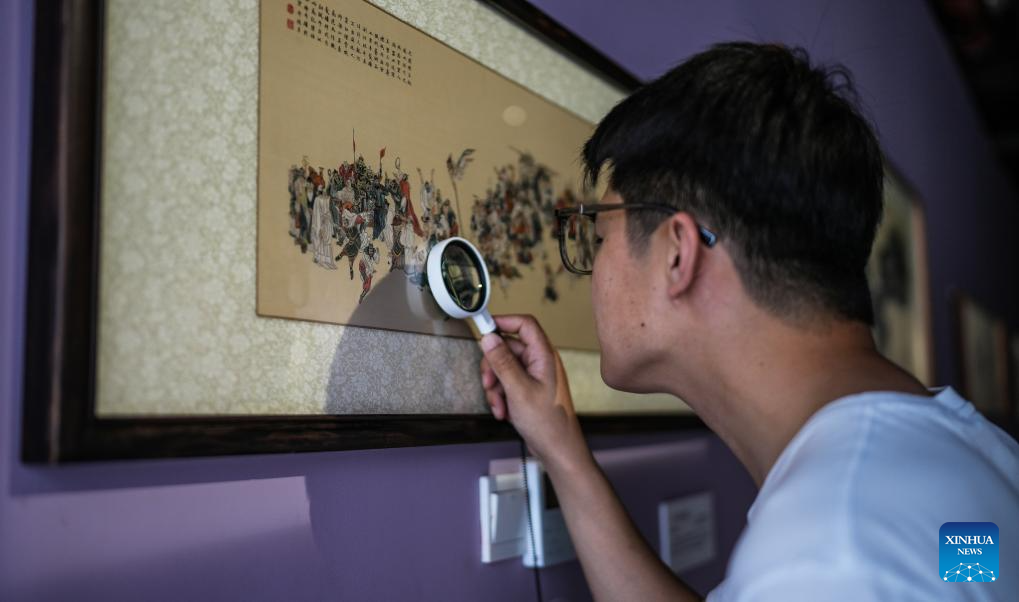 A visitor uses a magnifier to watch a hair embroidery artwork at a hair embroidery exhibition hall of a scenic spot in Dongtai City, Yancheng of east China's Jiangsu Province, June 6, 2025. (Xinhua/Tao Liang)