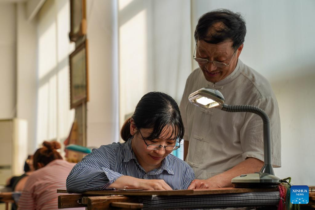 Chen Boyu guides an apprentice at the Jiali hair embroidery factory in Dongtai City, Yancheng of east China's Jiangsu Province, June 6, 2025. (Xinhua/Xue Yuge)
