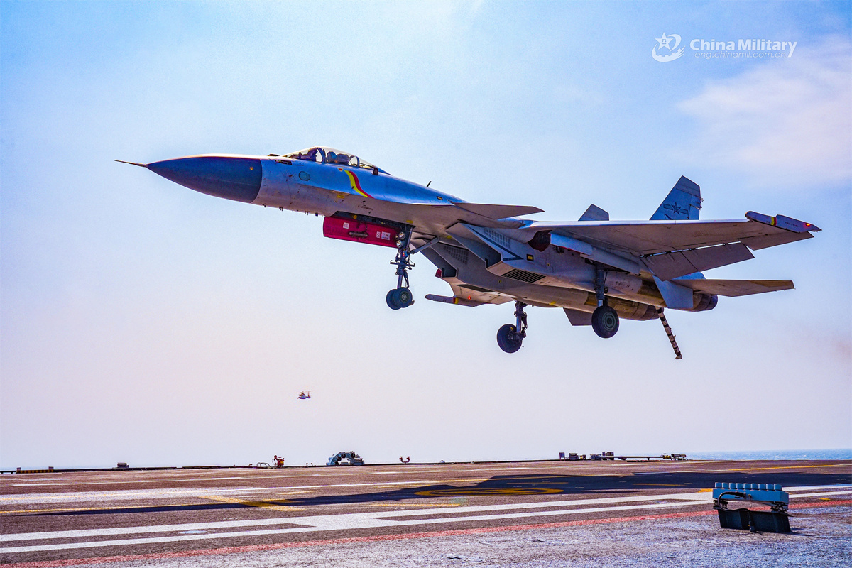 A J-15 carrier-based fighter jet attached to an aviation unit under the Chinese PLA Navy prepares to land onto an aircraft carrier during a flight training exercise in recent days. (eng.chinamil.com.cn/Photo by Zou Ning and Fu Jinquan)