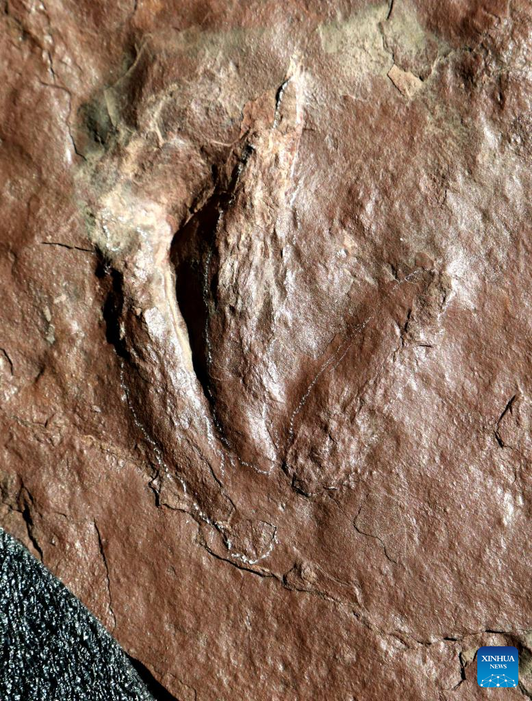 This photo taken on Feb. 19, 2025 shows the footprints discovered in Huaiji County, Zhaoqing City of south China's Guangdong Province. A research team from China University of Geosciences (Beijing) announced Thursday that it has recorded, for the first time, a combination of mammaliaform and dinosaur tracks in Cretaceous strata in Huaiji County, Zhaoqing City of south China's Guangdong Province. The newly discovered mammaliaform track measures just 1.8 centimeters in length, according to the research team. (Photo by Mi Jialin/Xinhua)