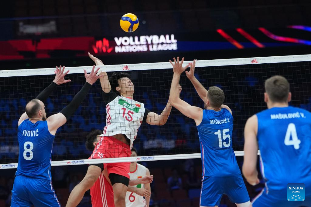 Peng Shikun (2nd L) of China spikes the ball during the Pool 3 match between China and Serbia at the Men's Volleyball Nations League (VNL) 2025 in Xi'an, northwest China's Shaanxi Province, June 12, 2025. (Xinhua/Li Yibo)