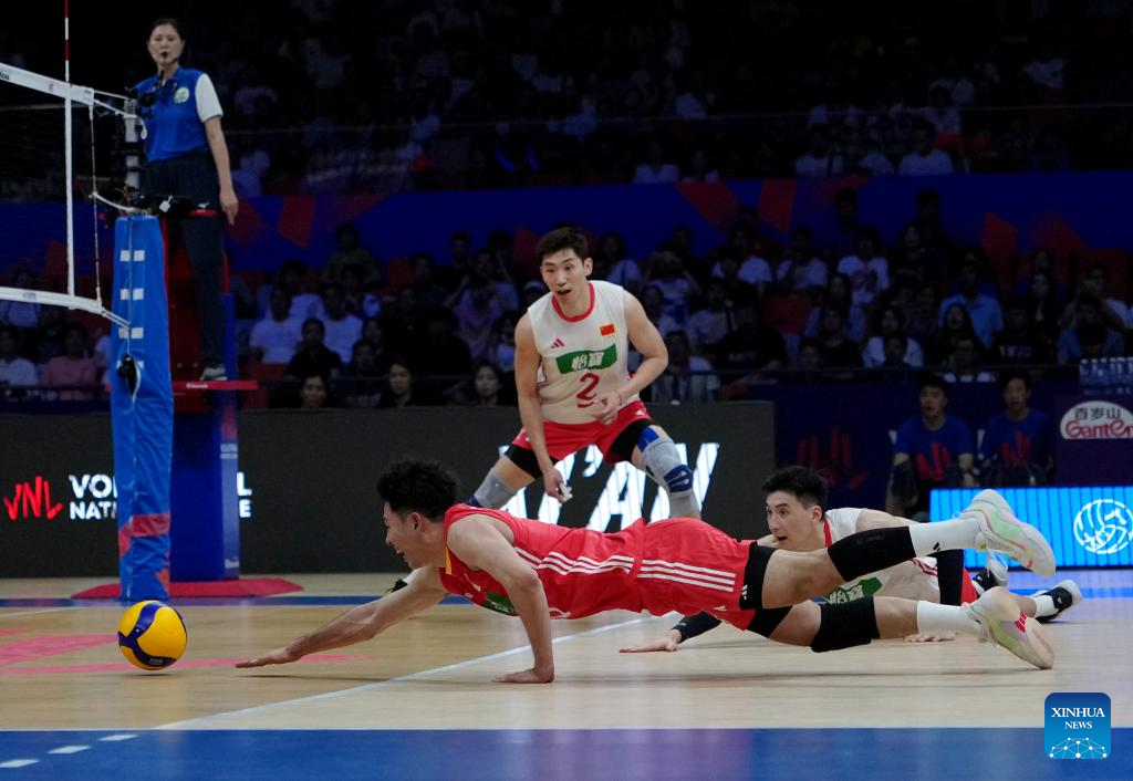 Qu Zongshuai (C) of China saves the ball during the Pool 3 match between China and Serbia at the Men's Volleyball Nations League (VNL) 2025 in Xi'an, northwest China's Shaanxi Province, June 12, 2025. (Xinhua/Li Yibo)