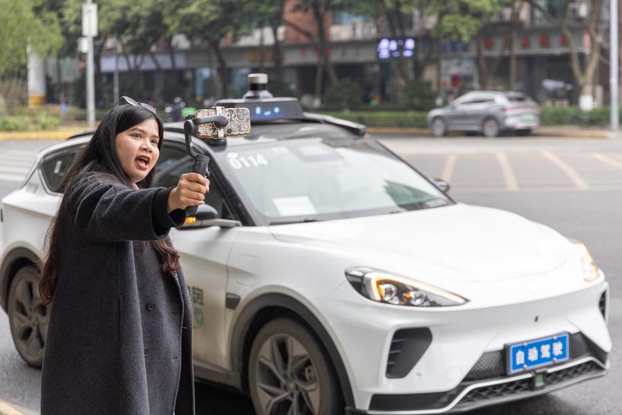 Yaowapa Sangjan, a Thai vlogger, shoots a video beside an autonomous-driving taxi in Yongchuan District of Chongqing, southwest China, Feb. 21, 2025. (Xinhua/Huang Wei)