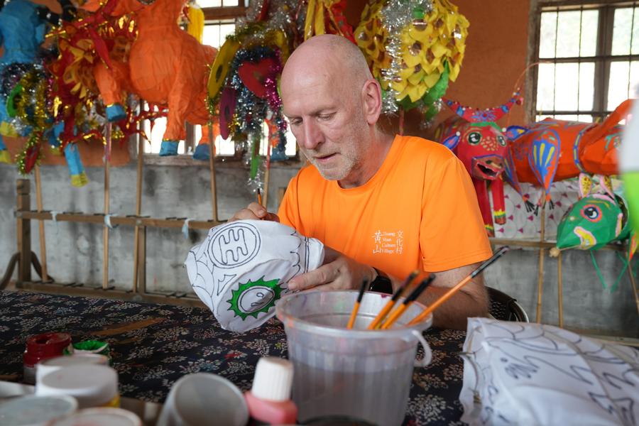 Armin Schober, an Austrian businessman, learns to make a traditional Chinese lantern in Hongcun Village of Yixian County, Huangshan City, east China's Anhui Province, April 8, 2025. (Photo by Hu Sheng/Xinhua)