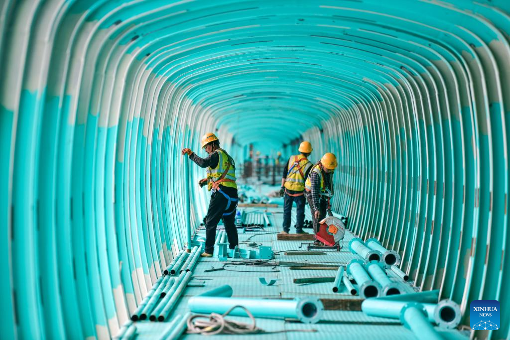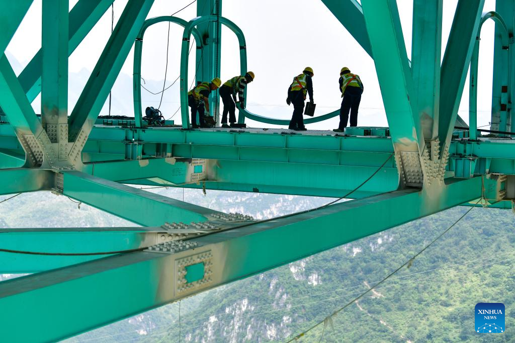 Workers build a sightseeing corridor at the construction site of the Huajiang Grand Canyon Bridge in southwest China's Guizhou Province, June 11, 2025. Tourism-related equipment at the Huajiang Grand Canyon Bridge is under construction.
