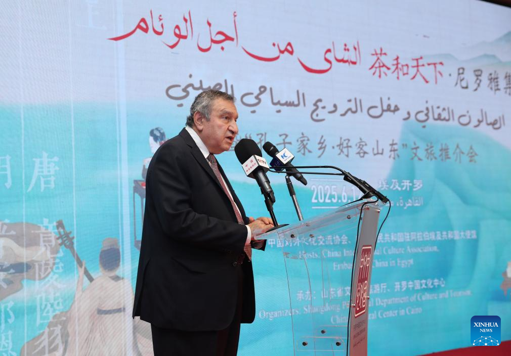 Essam Sharaf, former Egyptian Prime Minister, speaks at a tea-themed cultural salon in Cairo, Egypt, June 12, 2025. A tea-themed cultural salon, accompanied by a tourism promotion ceremony for east China's Shandong Province, captivated the Egyptian audience with the rich cultural traditions of the coastal province on Thursday. (Xinhua/Sui Xiankai)