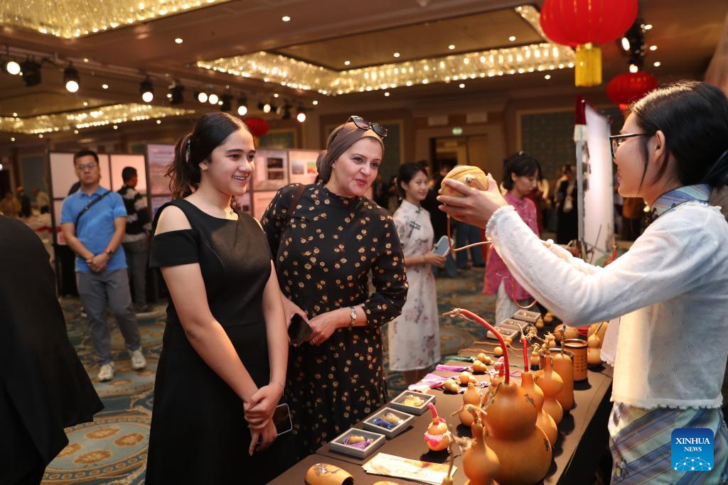 Visitors learn about the craftsmanship of Zhangqiu gourd carving at a tea-themed cultural salon in Cairo, Egypt, June 12, 2025. A tea-themed cultural salon, accompanied by a tourism promotion ceremony for east China's Shandong Province, captivated the Egyptian audience with the rich cultural traditions of the coastal province on Thursday. (Xinhua/Sui Xiankai)