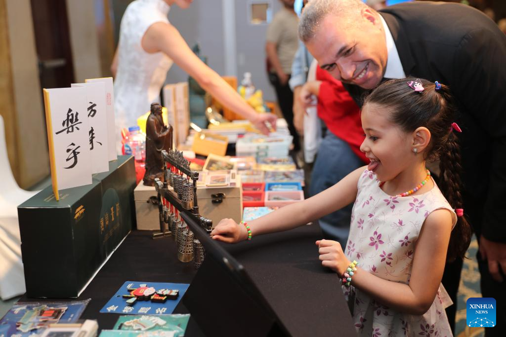 A girl learns about a cultural heritage-themed creative product at a tea-themed cultural salon in Cairo, Egypt, June 12, 2025. A tea-themed cultural salon, accompanied by a tourism promotion ceremony for east China's Shandong Province, captivated the Egyptian audience with the rich cultural traditions of the coastal province on Thursday. (Xinhua/Sui Xiankai)