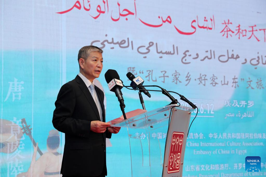 Liao Liqiang, the Chinese Ambassador to Egypt, speaks at a tea-themed cultural salon in Cairo, Egypt, June 12, 2025. A tea-themed cultural salon, accompanied by a tourism promotion ceremony for east China's Shandong Province, captivated the Egyptian audience with the rich cultural traditions of the coastal province on Thursday. (Xinhua/Sui Xiankai)