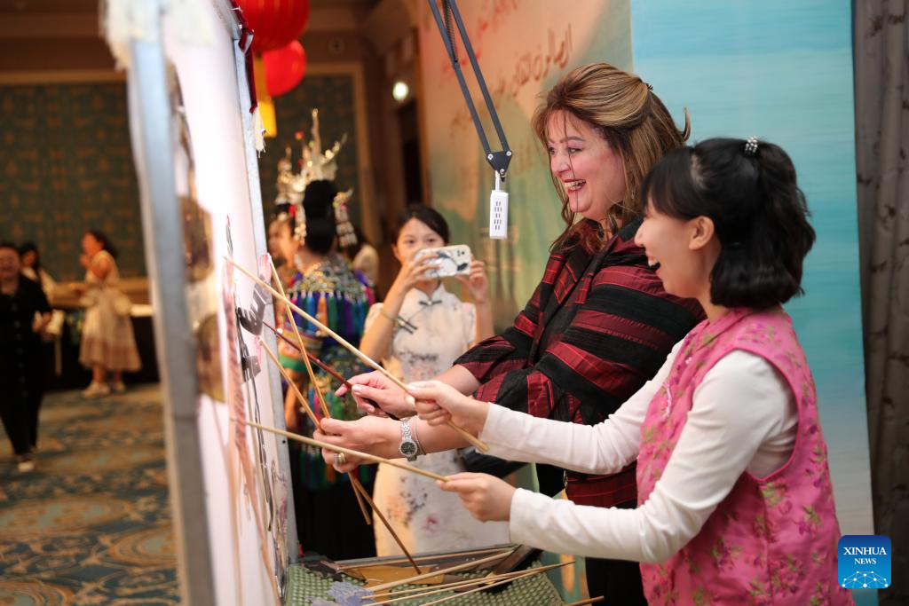A visitor tries Jinan shadow play at a tea-themed cultural salon in Cairo, Egypt, June 12, 2025. A tea-themed cultural salon, accompanied by a tourism promotion ceremony for east China's Shandong Province, captivated the Egyptian audience with the rich cultural traditions of the coastal province on Thursday. (Xinhua/Sui Xiankai)