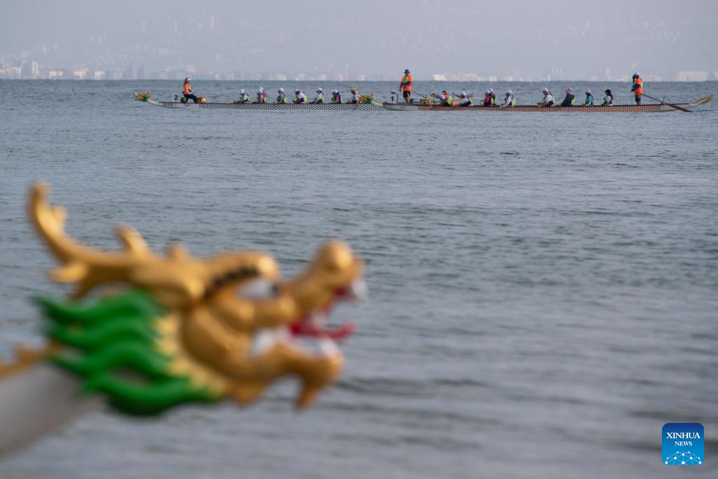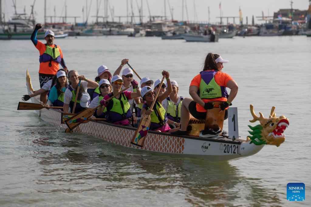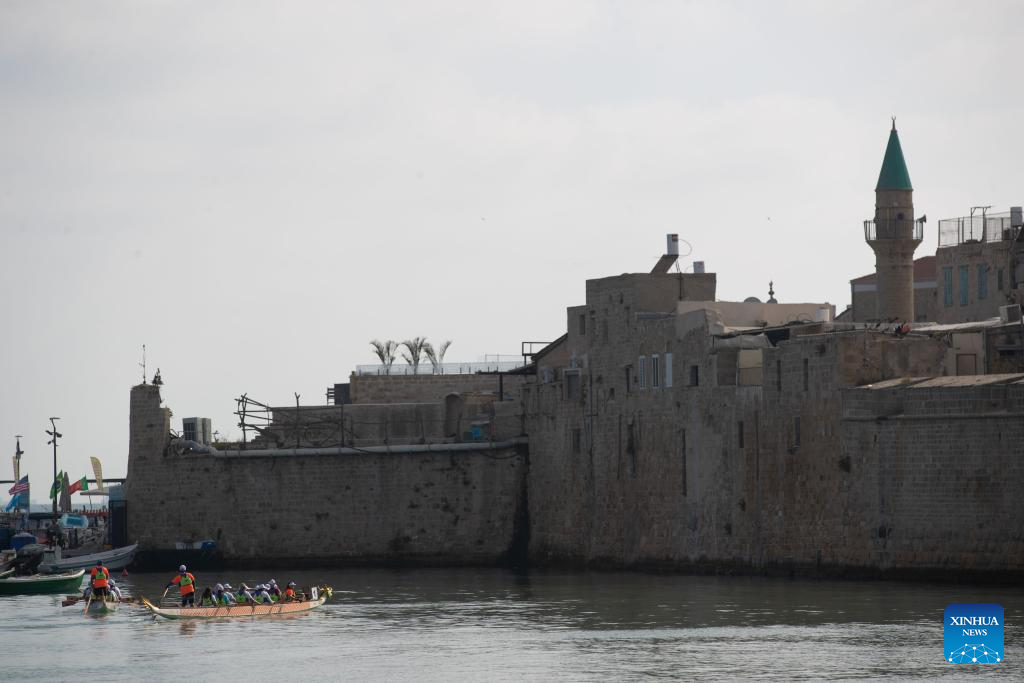 People paddle dragon boats during a dragon boat event in the northern Israeli city of Acre, June 12, 2025. A Chinese cultural event centered on dragon boat racing was held on Thursday in the ancient Israeli city of Acre. More than 300 participants competed in the traditional boat races along the Mediterranean coast. (Xinhua/Chen Junqing)