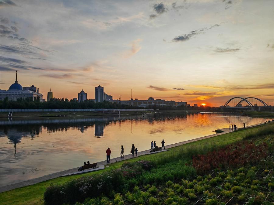 People enjoy leisure time by the Ishim River in Astana, Kazakhstan, June 12, 2025. (Xinhua/Yan Yan)