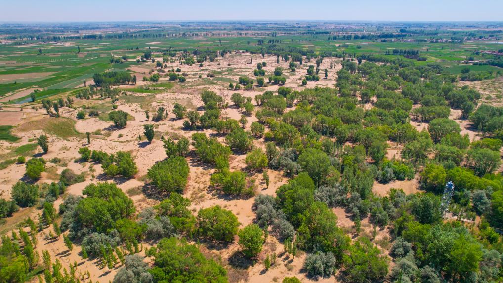 This aerial photo taken on June 14, 2023 shows a state forestry area in Linhe District of Bayannur, north China's Inner Mongolia Autonomous Region. (Xinhua/Liu Lei)