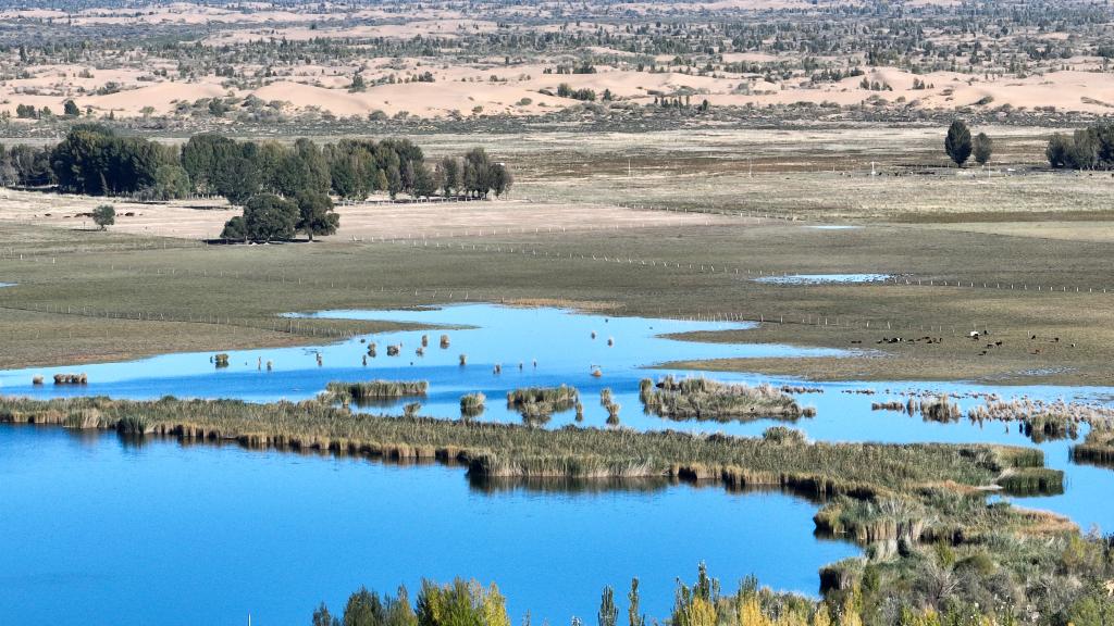A drone photo taken on Oct. 2, 2024 shows the autumn scenery of the Qixing Lake scenic spot in the Kubuqi Desert, in Ordos of north China's Inner Mongolia Autonomous Region. (Xinhua/Bei He)