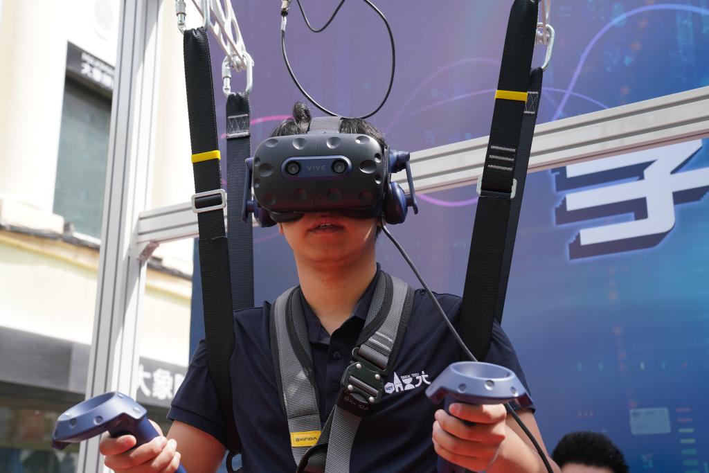A team member displays an immersive micro-gravity experience system during an exhibition showcasing innovation and entrepreneurship achievements among college students from the Harbin Institute of Technology on the Central Street in Harbin, northeast China's Heilongjiang Province, May 13, 2024. (Xinhua/Wang Song)
