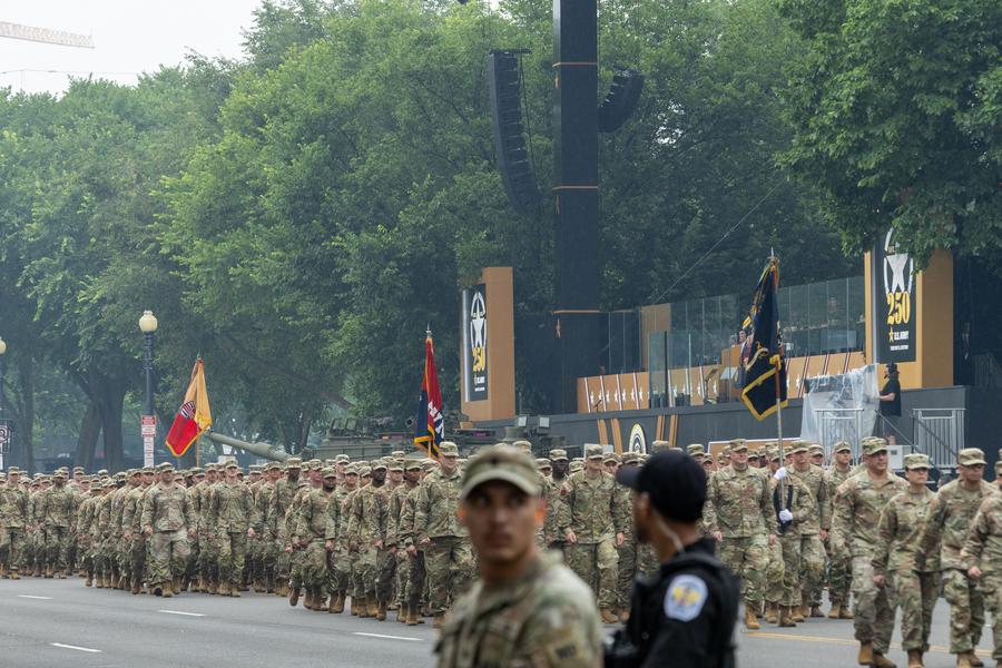 A military parade is held in Washington, D.C., the United States, June 14, 2025. U.S. President Donald Trump on Saturday hosted a military parade in Washington, D.C. to mark the Army's 250th anniversary with the participation of over 6,000 soldiers, 120 vehicles and a flyover. (Xinhua/Hu Yousong)